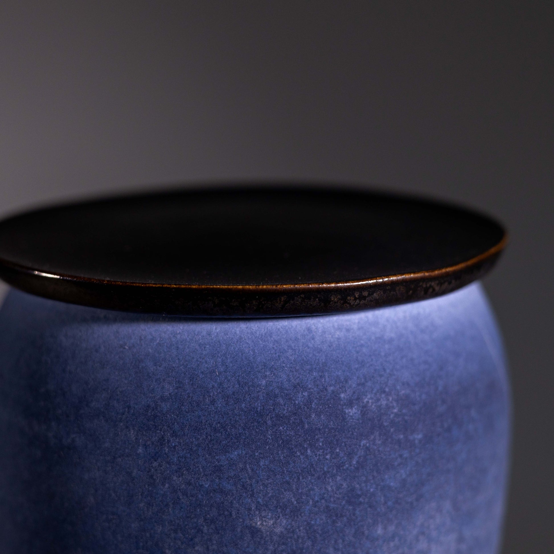 Stoneware lidded jar with a matte exterior and metallic black interior.