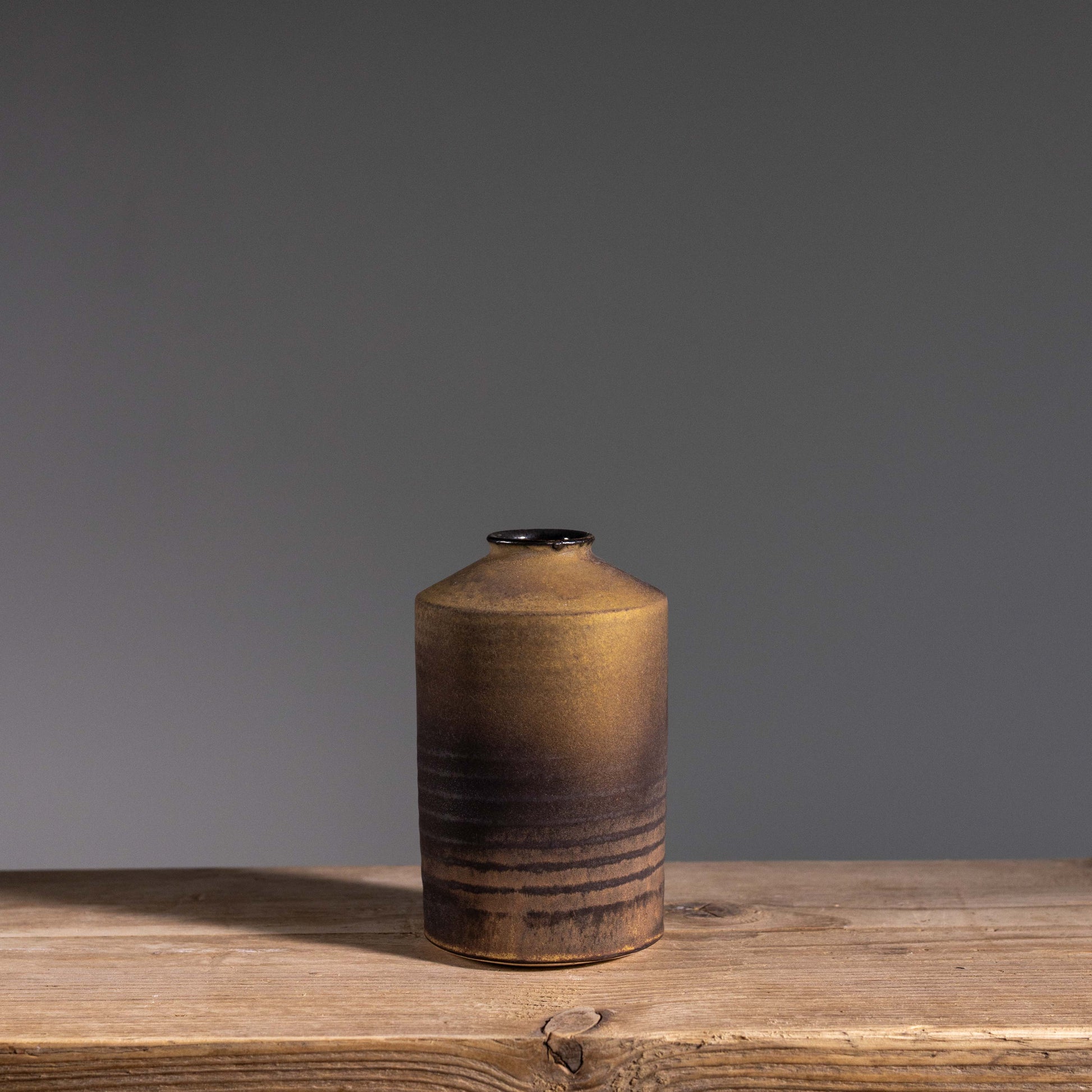 Stoneware vessel with a matte exterior and metallic black interior, designed for a small selection of flowers or to sit beautifully on its own.