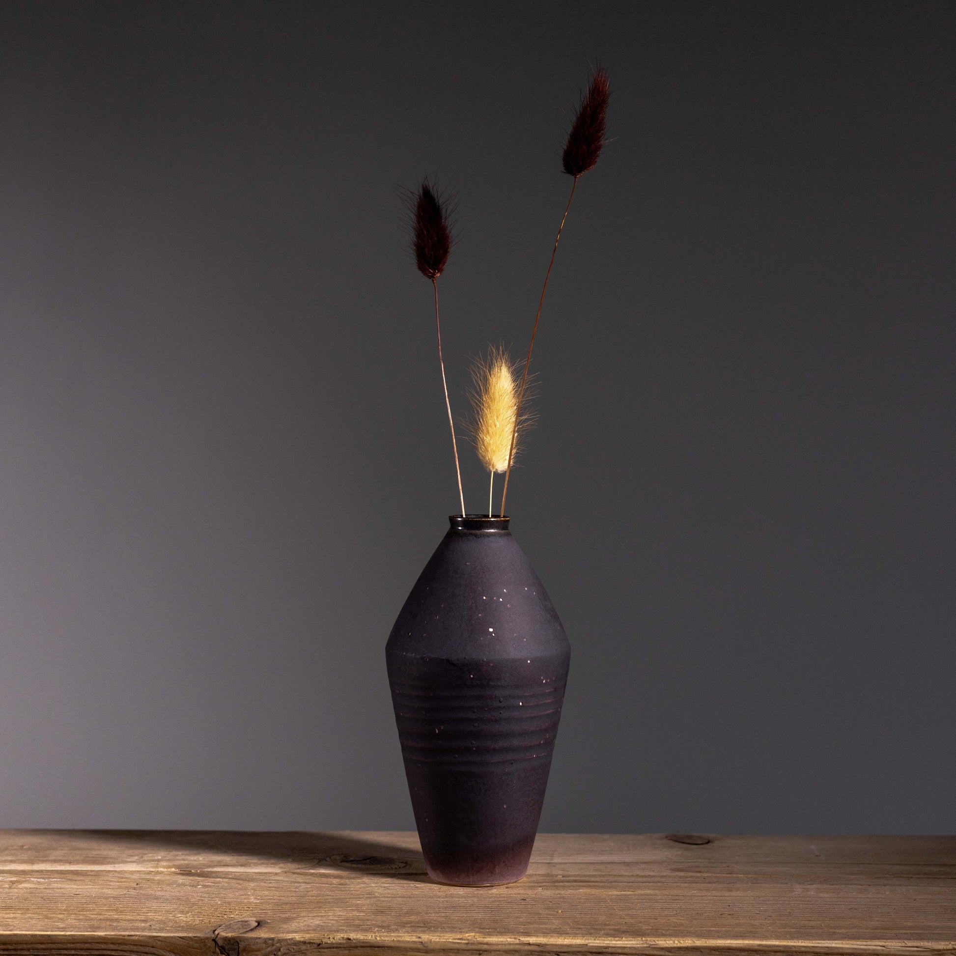 Stoneware vessel with a matte exterior and metallic black interior, designed for a small selection of flowers or to sit beautifully on its own.
